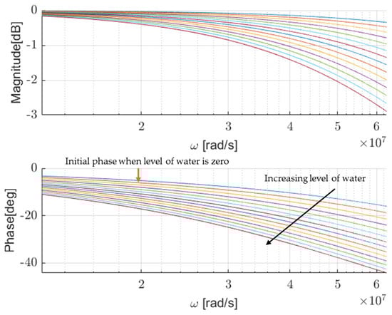 The simulated variations of the magnitude and phase as a function of increasing the level from 0 to 650 mm in steps of 50 mm using geometry 1 (UTP) as a two-conductor waveguide.