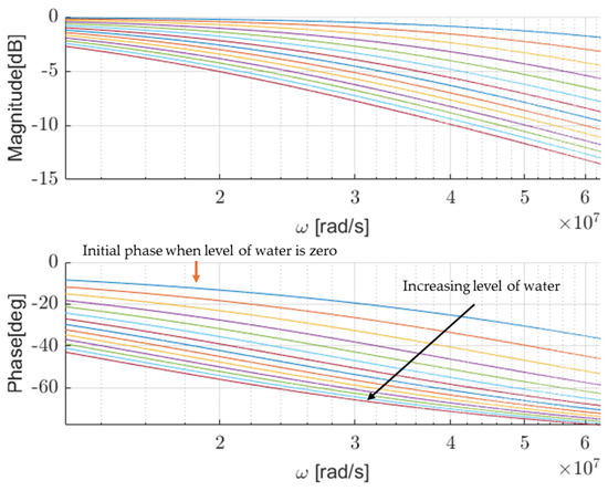Following the total capacitance for two geometries and working at 7.5 MHz for the length of 1.3 m, we can estimate the sensitivity and non-linearity of the level sensor using the two geometries. Figure 8 and Figure 9 show the frequency response of the sensor as a function of increasing the level of the water, following the obtained simulation results for geometries 1 and 2, respectively. Here, the level of water was simulated in incremental steps of 50 mm with a maximum level of 650 mm, considering a round trip of 1.3 m, which was the probe length.
