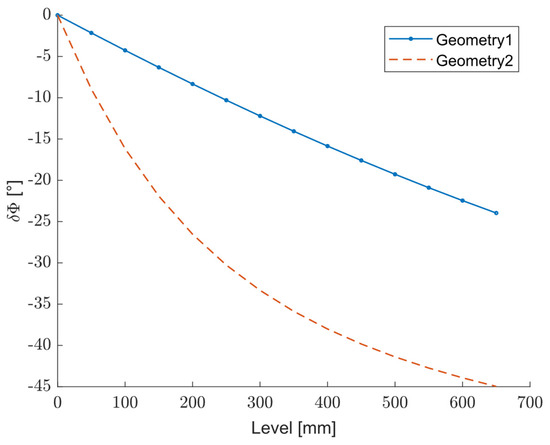 As shown in both figures, with increasing water levels (higher capacitance), the phase shift increases (a more negative shift at a given frequency), as expected by the known behavior of the lumped model of the proposed level sensor. Although the level sensor designed based on second geometry shows higher shifts compared to the first one, its behavior becomes non-linear. Figure 10 shows the estimated characterization curve of the developed sensor, based on the two simulated geometries. It indicates the phase shift, , in degrees as a function of increasing the level of liquid (water) in mm. For the first geometry, the phase shift decreases in an almost linear manner with the increasing water level, while for the second geometry it follows a non-linear curve, with higher sensitivity at lower levels.