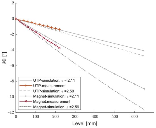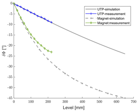 Simulated and measured differences in the phase shift versus level increments of the test liquid with a dielectric constant of using UTP and magnet wires.