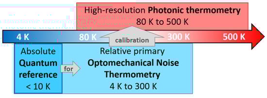 In the past decades, new types of temperature sensors have emerged [7]: noise thermometry [8], Doppler broadening thermometry [9,10], phosphor thermometry [11], Nitrogen-Vacancy diamond thermometry [12], fibre-optics thermometry [13,14], on-chip photonic [15] and optomechanical techniques [16,17], etc. Based on different physical principles, they have a potential to overcome the drawbacks of “conventional” temperature sensors and could offer fit-for-purpose and cost-effective measurement solutions. Among these emerging technologies, on-chip photonic and optomechanical sensors have an advantage to be easily integrated on a chipset, which makes them suitable for practical in situ applications.