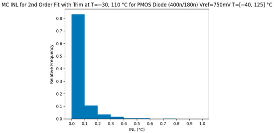 The sensing unit renders good results when process variations and trim temperatures are introduced. A yield of 91.25% is achieved with trim temperatures of −30 and 110 °C. A distribution of the INL is shown in Figure 4.