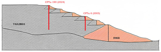 Figure 1 presents a typical cross section of the dam, indicating the relative positions of two CPTu soundings, for example: CPTu 6 (2005), performed on the crest of a dike, and CPTu 190 (2024), executed farther into the reservoir, within the tailings deposit. Between 2005 and 2022, the dam underwent three upstream raises, resulting in an elevation gain of approximately 8 m. These construction stages significantly altered the internal stress distribution and hydrogeological conditions of the tailings mass. The underlying layers experienced additional self-weight consolidation and increased effective stress due to the progressive placement of overburden. Simultaneously, the phreatic surface migrated away from the dikes.