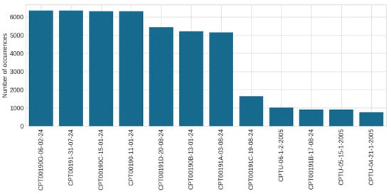 The dataset used in this study contains measurements of , , , and u () from CPTu tests conducted in an iron mining tailings dam in Brazil. In total, the dataset contains 12 different tests, with varying locations and dates of test execution. Figure 2 depicts the number of measurements for each variable in the different tests. The nomenclature used for tests is , where refers to the company’s identification for the test and is the date of test conduction (day–month–year).