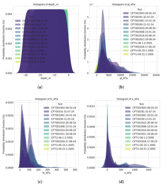 To provide a clear understanding of variables’ distribution among the tests, we plot, in Figure 3, the probability distribution function (PDF) of depth (Figure 3a), (Figure 3b), (Figure 3c), and u (Figure 3d). The results show that most tests have similar behavior regarding u and depth, with distinctions occurring in and values. Also, one can note that changed severely among different locations in the site for the tests realized in 2024. Since sleeve friction reflects the interaction between the cone’s sleeve and the surrounding soil, it is highly influenced by physical properties of the material, such as grain size distribution, degree of saturation, and mineral composition. This spatial variability in highlights the importance of conducting analyses using data from closely spaced locations. Ignoring such heterogeneity may lead to misleading interpretations, particularly in applications such as the temporal monitoring of tailings deposition through clustering techniques.