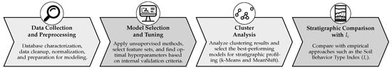 Methodological workflow of the proposed approach, encompassing data preprocessing, unsupervised model selection and tuning, cluster-based analysis, and stratigraphic comparison via the Soil Behavior Type Index ().