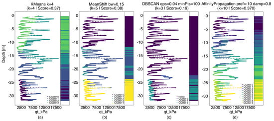 Clustering result of soil stratigraphic profile for (a) k-means, (b) MeanShift, (c) DBSCAN, and (d) Affinity Propagation.