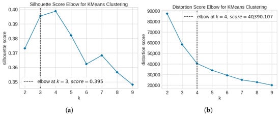 A wide range of validation indices is available in the literature for tuning unsupervised machine learning models [38]. Regarding k-means, the algorithm depends on initially defining the number of clusters. As discussed in Section 3.3, we rely on both the silhouetteand the elbow approaches for establishing such a value. Figure 7 depicts the silhouette and elbow charts. While the elbow chart (Figure 7b) suggests using four clusters, the silhouette chart (Figure 7a) indicates three clusters, given the larger increase from to than from to . However, upon further inception demonstrated to have higher cohesion and separation for the context of this application, this result was used for results and discussions. Also, the silhouette score with was higher than with . Similarly, since Affinity Propagation is highly sensitive to Euclidean distances, we used the silhouette index to tune its regularization parameters, resulting in preference and damping values of and , respectively. For DBSCAN and MeanShift, we employed the DBCV index, which is more appropriate for density-based clustering as it directly accounts for density rather than distance [34].