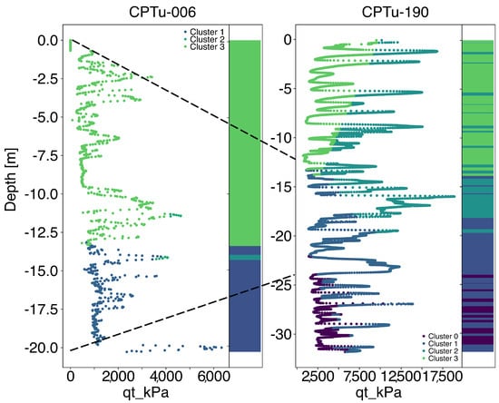Clustering application. After finding the clustering models with better results, the third step consists of applying the clustering algorithms and analyzing the distribution of groups across the different tests. In other words, this step intends to understand whether the realized clustering can provide meaningful results for the geomechanical profiling of soils. To reach such an objective, we plot the values of against the depth of measurement and vary the color according to the cluster number defined by the model. The reason for choosing is that such a metric exhibits less fluctuation in the PDF’s distribution (Figure 2) and because its value already includes u. Also, we analyze how clustering disposal varies with time by comparing profiles originating from closely spaced locations.