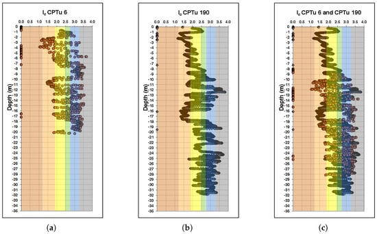 versus depth. (a) CPTu 6; (b) CPTu 190; (c) CPTu 6 and CPTu 190. Colored bands represent the intervals and corresponding soil behavior types described in Table 1.
