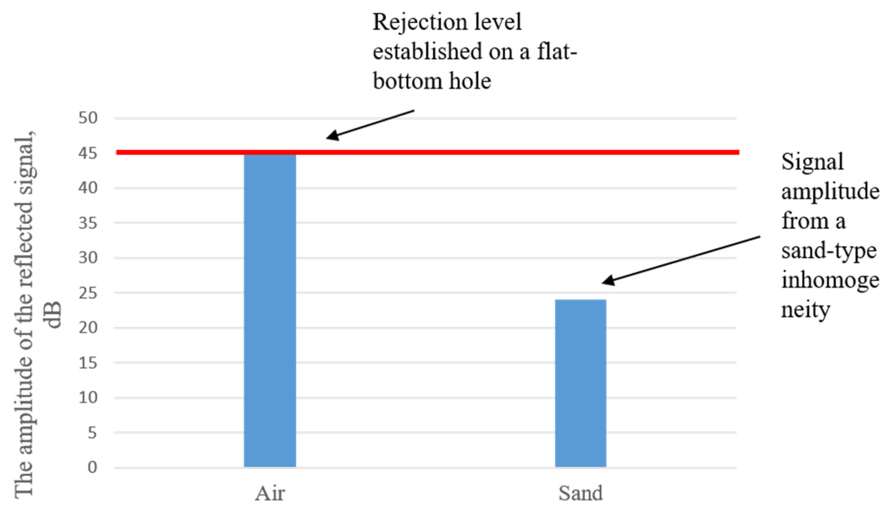 - Evaluation of defect detectability when calibrating the rejection sensitivity level using different reflector types: Sensitivity levels (in this study, the calibrated sensitivity level was designated as the rejection threshold) were established for reflectors of identical dimensions but with varying filler materials. Subsequently, ultrasonic testing was performed on specimens containing a known quantity of artificially introduced discontinuities in the form of sand inclusions with uniform dimensions.