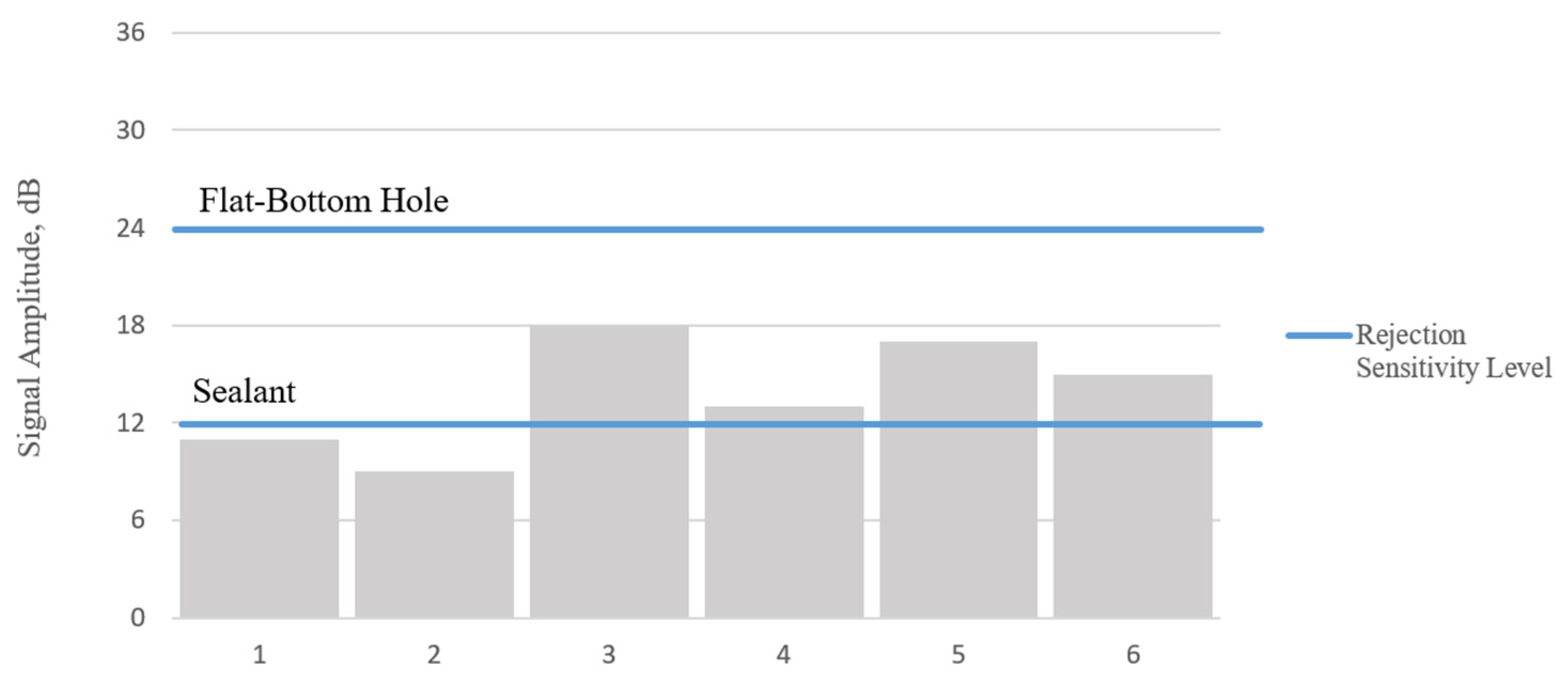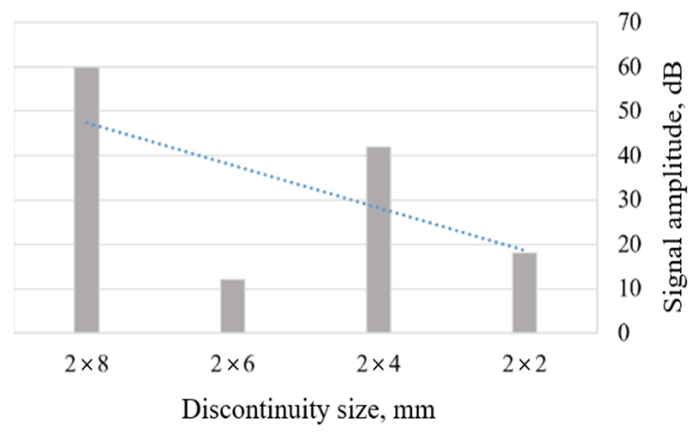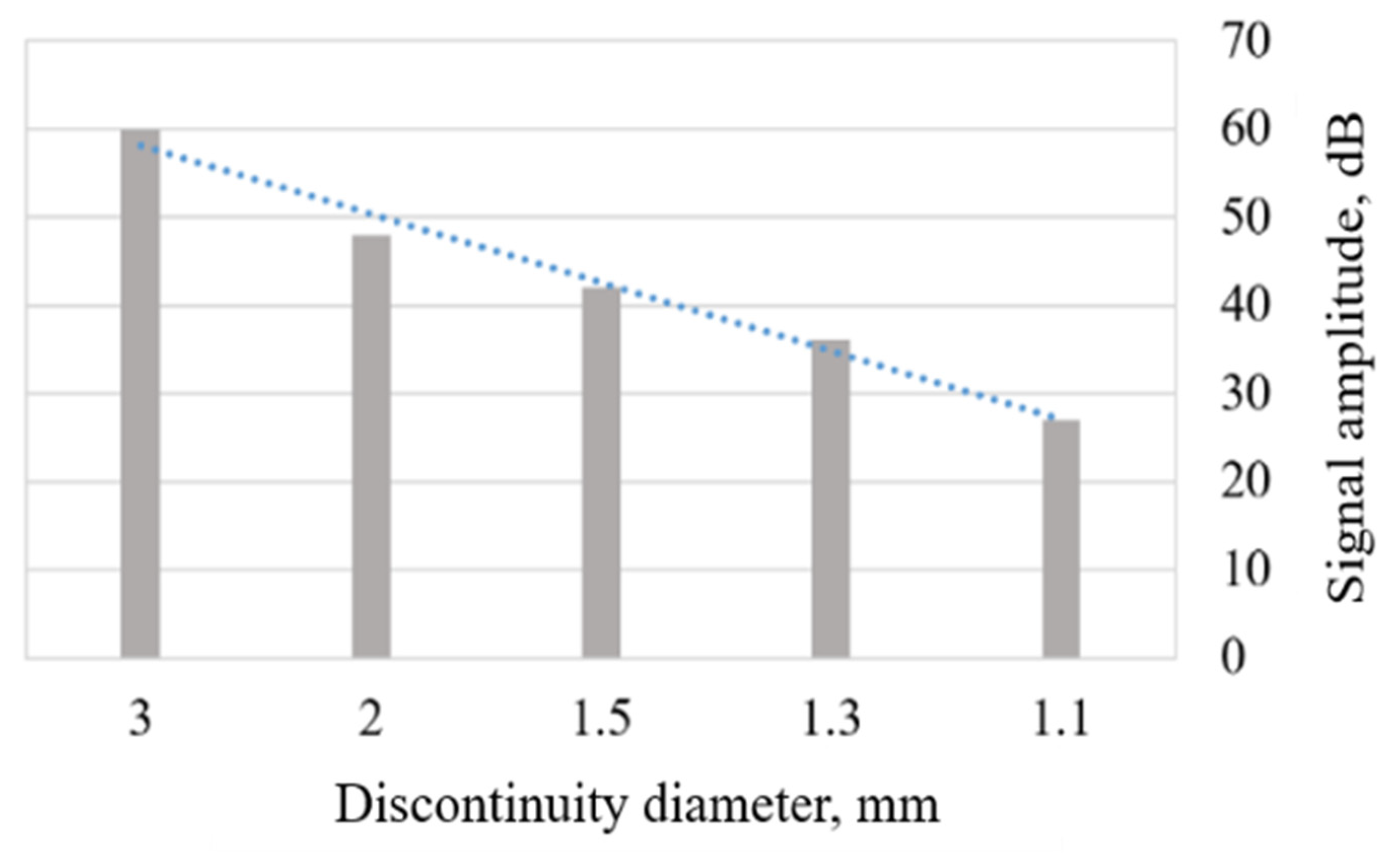 - Unlike the acoustic field parameters of signals reflected at the polyethylene/air interface, the acoustic field parameters of signals reflected at the polyethylene/sealant interface are equivalent to those from real defects in welded joints of polyethylene pipelines. At the same time, the reflectivity of air inclusions remains the highest, which enables the detection of all defect types when the rejection sensitivity level is calibrated using sealant-type inhomogeneities.