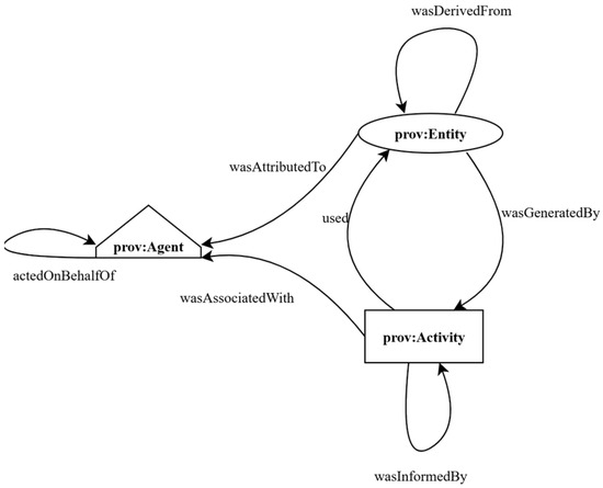 Provenance is a structured metadata set that provides comprehensive information about an object of interest, including its origins and the processes it has undergone over time. It encompasses the sources from which data have been derived and the justification for creation and transformation processes [15]. Provenance metadata form a graph that describes relationships among elements contributing to a piece of data or a thing [16]. This metadata is crucial for assessing quality, verifying authenticity, and evaluating trustworthiness [17]. The W3C PROV data model accommodates different provenance perspectives, allowing for diverse metadata records [18]. The PROV data model is built around the core classes: Entity, Agent, and Activity. Figure 1 illustrates the core components of the W3C PROV family of specifications, which describe the use and production of entities by activities, potentially influenced by agents [7,15].