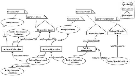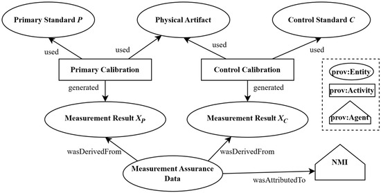 Provenance core classes serve as extensible containers for domain-specific details. Domain-specific metadata that extend PROV activities, entities, and agents integrate metrology-specific details. Relevant metrological details include metadata descriptions for quantities and units, such as the D-SI model used in the DCC [24]. These metadata may reference unique identifiers to quantities and units, such as those provided by the SI Digital Framework or the M-Layer [25,26]. Taxonomies that describe measurands attributed to measurement results and calibration certificates, measurement capabilities, and instrument specifications help to link provenance information across these related quality infrastructure documents and metadata [27]. Ontologies describing measurement processes provide further description of activities and entities detailed in provenance metadata [28]. As a high-level concept, provenance enables digitalization in the scientific metrology community.