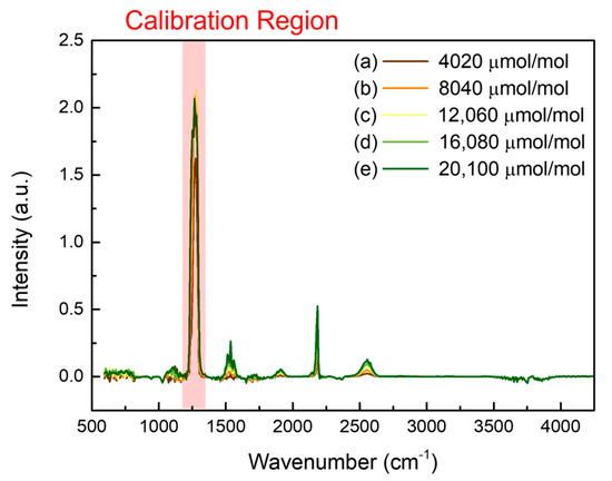 Before the analysis using FT-IR, the FT-IR must be calibrated because the intensities in FT-IR are converted to concentrations. In detail, FT-IR, which has resolution of 8 cm−1 and cell length of 5 m, was used to measure the concentration of CF4 and NF3 gases. To convert the absorbance measured by FT-IR into concentration, calibration curves for each gas were established using certified reference materials (CRMs). For CF4, peaks were observed in the 1236–1292 cm−1 range based on HITRAN databases and previous studies [26,27,28]. Accordingly, the special range of 1200–1330 cm−1, which includes this peak region, was selected for CF4 detection. To cover both low and high concentration ranges, a five-point calibration was conducted by diluting 20,100 mol CF4 CRM gas with N2 gas, yielding calibration points at 4020, 8040, 12,060, 16,080, and 20,100 μmol/mol. The example of calibration range is shown in Figure 1 and Figure 2. Similarly, for NF3, characteristic peaks were observed in the 850–1032 cm−1 range, and the broader range of 805–1100 cm−1 was selected for NF3 detection [29,30]. A ten-point calibration was also performed by diluting 20,000 μmol/mol NF3 CRM gas with N2 gas, with calibration points at 2000, 4000, 6000, 8000, 10,000, 12,000, 14,000, 16,000, 18,000, and 20,000 μmol/mol. Unlike CF4, ten-point calibration was adopted for NF3 because it tends to dissociate more readily than CF4. Thus, even under identical plasma conditions, the measured NF3 concentrations were expected to be lower. To ensure an extended calibration range and maintain accuracy, a denser calibration set was employed.
