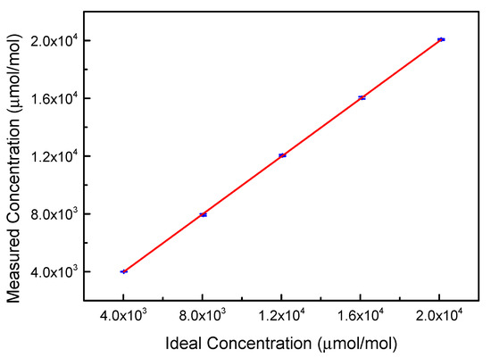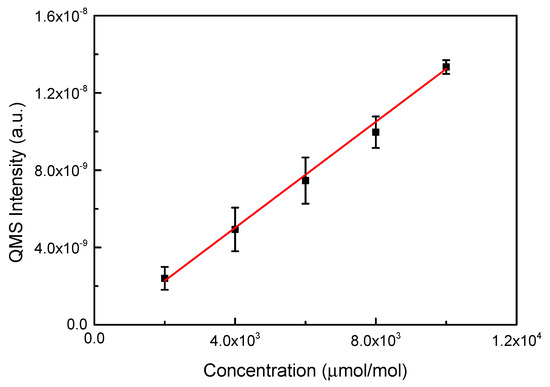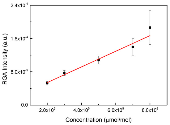 QMS calibration was conducted using Kr diluted in N2 at concentrations of 0.2, 0.4, 0.6, 0.8, and 1 × 104 μmol/mol, as shown in Figure 4, yielding an R2 value of 0.99, indicating a strong correlation. Similarly, RGA calibration followed the same procedure, with calibration points at 2, 3, 5, 7, and 8 × 105 μmol/mol, as illustrated in Figure 5, resulting in an R2 value of 0.97, confirming reliable calibration. These five-point calibration values were deemed acceptable for subsequent measurements.
