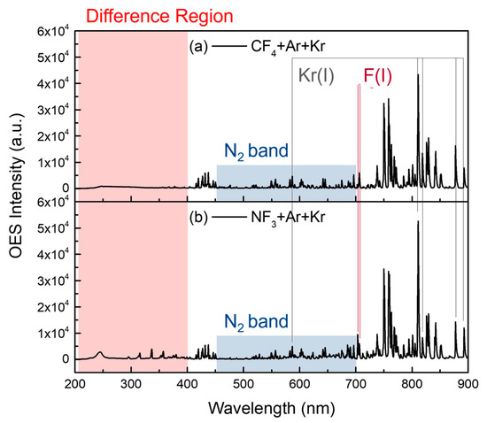 The OES spectra of gas mixtures: (a) CF4/Ar/Kr mixture (b) NF3/Ar/Kr mixture. The red region describes the difference between two gas mixtures, whereas the blue region describes the N2 band.