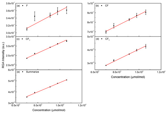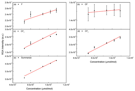 The fragment components of CF4, including CF3, CF2, CF, and F, under plasma-on conditions, are presented in Figure 6a–d, while Figure 6e illustrates the total contribution of all detected species. The graphs in Figure 6 exhibit a consistent trend. The obtained R2 values for all fragment species exceed 0.9, indicating a strong correlation and reliability of the measurement data. However, the deviation observed in the CF4 component suggests that its decomposition rate may be influenced by factors such as concentration, plasma power, or reaction kinetics. A higher CF4 concentration may result in a greater extent of dissociation, leading to non-linear behavior in its fragment component detection.