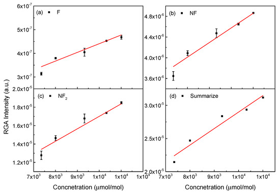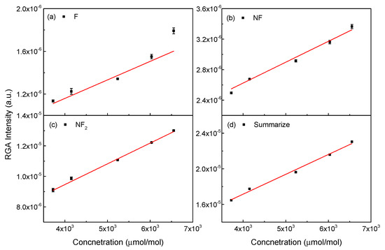 The analysis of NF3 followed the same procedure as that of CF4, with the goal of establishing a correlation between RGA intensity and FT-IR measurements to quantify gas concentration accurately. The fragment components of NF3, including NF2, NF, and F, under plasma-on conditions, are shown in Figure 8a–c, with Figure 8d presenting the total summation of all components derived from NF3. The data exhibit a consistent trend where an increase in NF3 concentration corresponds to an increase in RGA intensity. The obtained R2 values for all fragment species exceed 0.9, except for Figure 8a, further confirming the reliability of the measurement data. Moreover, Figure 8a also represents almost 0.9 of R2 value. This result suggests that our method effectively captures the dissociation behavior of NF3 and the corresponding detection of its fragment species.