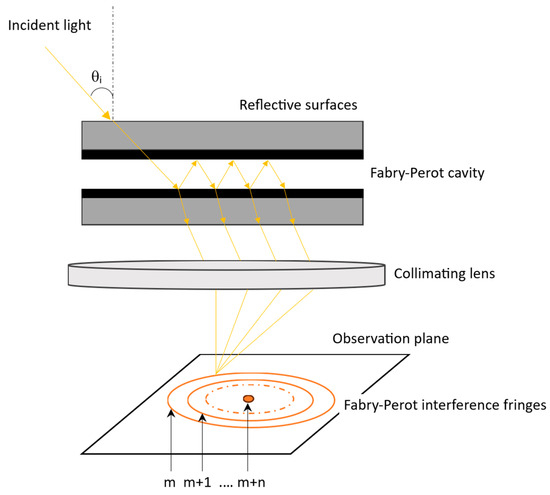 Emerging from this phenomenon, Fabry-Pérot interferometer was built in 1899, based on which, lately, interferometric sensors were developed [26]. As presented in Figure 1, the reflected rays interfere with each other to produce sharp fringes in the transmitted field. After focusing by lens, the interference fringes result in a set of concentric circles. To achieve bright circular fringes, the path length difference between two adjacent rays must match the condition: