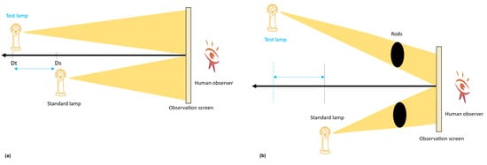 The first scientific attestation of the achievement of a photometer was published in 1760 by Pierre Bouguer. The instrument compared the brightness of two light sources, a standard lamp and a test lamp, whose distance from the screen (Dt and Ds) was modified until the comparison screen achieved the equal perceived brightness on each side (Figure 2a). Concomitant, Johann Heinrich Lambert developed a photometer (Figure 2b) intended on quantifying light attenuation through a medium. The same two sources cast two shadows from the rods on the screen, and the observer equalized the two intensities visually. Its first practical application was in 1972 in a military house in Munich, when Benjamin Thompson, also known as Count Rumford, compared different candles and gas lamps to quantify their efficiency [31]. Before Rumford, photometric comparisons were mostly qualitative (subjective observations). His method introduced a more practical, repeatable, and easy-to-use approach for measuring light intensity. Both photometers were designed based on the principles of light attenuation and intensity comparison, leading to the development of Bouguer’s Law (Equation (5)) and later the Beer-Lambert Law (Equation (6)).
