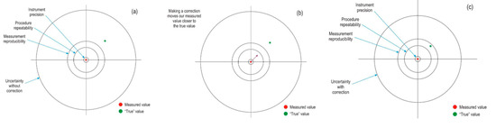 Relationship between accuracy, uncertainty, and correction: (a) measured value, “true” value, and contributions to measurement uncertainty; (b) making a correction to the measurement result; (c) improved situation after making a correction [46].