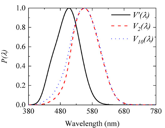- Ding, J.; Yao, Q.; Jiang, L. Comparisons of Scotopic/Photopic Ratios Using 2- and 10-Degree Spectral Sensitivity Curves. Appl. Sci. 2019, 9, 4471. [Google Scholar] [CrossRef]