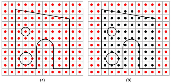 Then, the component’s CAD is placed within the 3D grid and the discrete points of the elementary finite rectangular parallelepipeds whose areas intersect the CAD model are considered as obstacles and are represented in black. It is worth noting that even if a small part of the CAD is located in the region of the finite rectangular parallelepiped, its discrete point is considered an obstacle. Figure 2a shows a 2D example of placing a CAD file in a grid environment and Figure 2b the representation of obstacles. The modeling accuracy depends on the grid’s density.