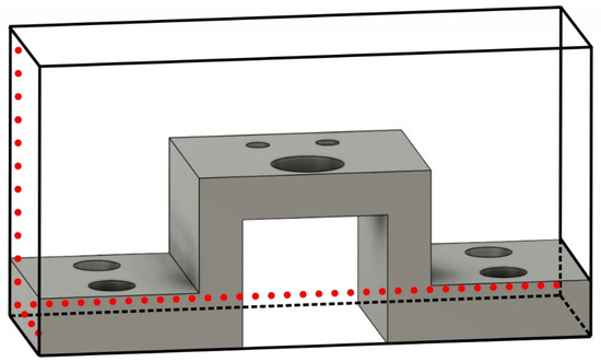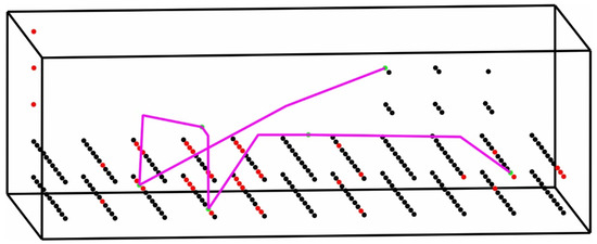 Figure 8 shows the 3D environment and the modeling of the component in the form of obstacles resulting from the CAD file. The points where the measurement procedures will be performed are marked in green. In the case where the measurement points are located around the perimeter of the component, during the environment creation process, it would be necessary to have free movement points around the component. However, in the examined scenario, the measurement points are located on the component, thereby it is not necessary to add additional free movement points surrounding the component. Adding additional free points increases the complexity of the 3D space and the computational resources without benefiting the search for finding a shortest path.