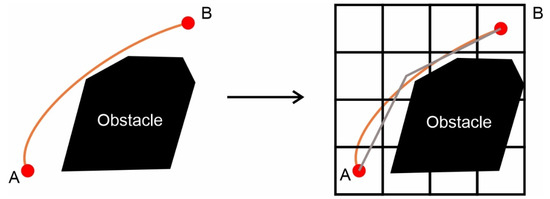 Some other advantageous factors during the CMM’s probe path planning process are the linear motion between the coordinates in 3D space and the small number of points on the final path. The measuring probe is very sensitive and if it unexpectedly touches a part of the component during its transfer from one area to another while the measuring process is not being performed, it may break or the probe protection system of the CMM may be activated and completely immobilize the machines. Both circumstances negatively affect the measuring process by greatly increasing the cost and the measurement time unnecessarily. The length of the curved movement between two points can, in some cases, be shorter than the combination of multiple linear movements in order to travel the same distance. This phenomenon occurs due to the discretization of the environment. However, during the transfer process, the probe is located at a greater distance from the examined part and the contact due to some micro-scaled mistake placement of the piece becomes more difficult. Figure 4 shows an example of transferring from one point to another using a curved trajectory and a multiple linear trajectory. The reduced number of points of the total path accommodates the rectilinear transport from one point to another without intervening intermediate points of the same line equation and the resolution of movement constraints in a grid environment as described in [28]. Moreover, the slightly enlarged representation of the CAD model in the form of obstacles described in Section 2.1 assists in avoiding this phenomenon.