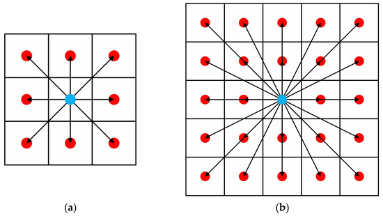 Representation of movement points navigation models from the current position: (a) the navigation model of 8 possible movement points; (b) the navigation model of 24 possible movement points.