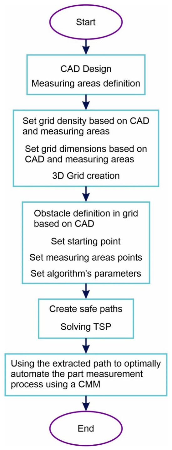 The advancement and the increasing application of manufacturing technology have widely expanded the use of CMMs. Measuring the tolerances of manufactured parts is a required daily concern in the production cycle of the manufacturing industry. A key task of this process is the inspection of the manufactured part using a CAD drawing. Many of the manufactured parts come from the same CAD drawing. Thus, their inspection process can be automated and performed repeatedly by a CMM without the need for operator intervention. The CMM’s probe path planning can be generated either manually or using a path planning method. Several methodologies have been developed for finding the optimal path that connects two points without causing any collision or damage to the robot. Some of the successful path planning algorithms are the ant colony optimization (ACO) [1], genetic algorithms [2], rapidly exploring random tree (RRT) [3], neural network [4], probabilistic roadmap algorithm (PRM) [5] and A* algorithm [6].