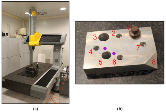 The 5-axis CMM shown in Figure 7a was used for the application of the proposed procedure. Figure 7b shows the experimental measuring component. A large number of measurement procedures provided by CMMs can be simulated on the experimental measuring component. More specifically in this example, measurements are conducted on the inner perimeter of two holes, around the small cylinder in area 1, at two points on the surface of the workpiece and on the inclined surface of area 8. In Figure 7b, the positions of the points on the surface of the component are shown in purple. Furthermore, in this example, a thin grid environment is used to emphasize the description and clear presentation of the methodology. The positions of the measurement points and the accuracy of the results can be significantly improved by using a denser grid environment. The presented methodology was developed using Matlab R2016a (The MathWorks, Inc., Natick, MA, USA) and python (Python Software Foundation, Wilmington, DE, USA). The operation of the CMM was facilitated using the PC-DMIS 2021.2 (Hexagon Manufacturing Intelligence, North Kingstown, RI, USA) software package.