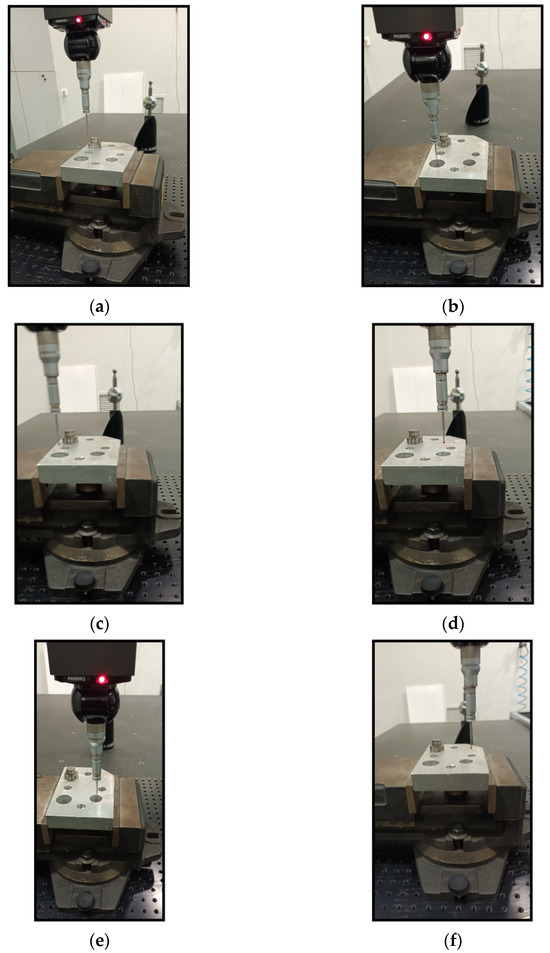 Figure 10a–h show the CMM’s probe location during the execution of the resulting path. The probe was successfully moved to the final coordinates of the resulting points without colliding with the experimental component. As can be seen from the images, the piece was placed in the inner part of a vice in order to immobilize it and keep it stationary during the measurement process. This procedure is widely applied in the measurements. It is worth noting that the positions of the vice and the point O (0,0,0) of the component’s virtual grid in the CMM operating space are known. The transfer of the probe to the initial coordinate position of the resulting path is carried out from a safe area to ensure that there will be no collision before the path is executed. As the measurements are to be performed above the plane of the vice and the designed path will lie within the component’s volume or the space above it, the vice does not influence the measurement process and therefore does not require to be modeled in the grid environment. If measurements were to be conducted on the side surface of the component, it is probable that the created path would traverse through the spatial area occupied by the vice. Under these circumstances, it would be necessary to model in the grid environment the parts of the vice that may hinder the movement of the probe. The entire vice would need to be modeled in the grid environment in the case where the locations of the examined measurements were on multiple components in the CMM’s operation environment.