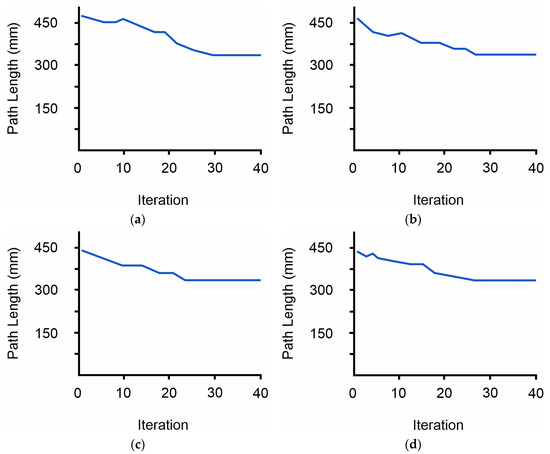 Diagrams of path lengths per iteration for solving the TSP: (a) Case A for the sequence of inputted points; (b) Case B for the sequence of inputted points; (c) Case C for the sequence of inputted points; (d) Case D for the sequence of inputted points.