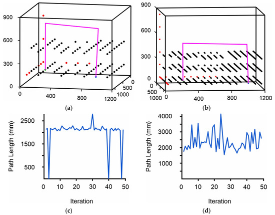 The sequence of inputted points does not affect the length of the final solution; it alters the resulting path length per iteration diagram as well as the dynamics of the algorithm’s convergence. This is evident in Figure 11a–d where each diagram was generated from a different inputted sequence of points. The variations in the dynamics of the convergence of the algorithm are not related to the sequence of input points but to its inherent stochastic behavior and the initial values of the parameters. Specifically, the roulette wheel method enables the random selection of all the available options. Even though the possibility of selecting some options is low, they can still be selected. This variability can lead to different convergence patterns.