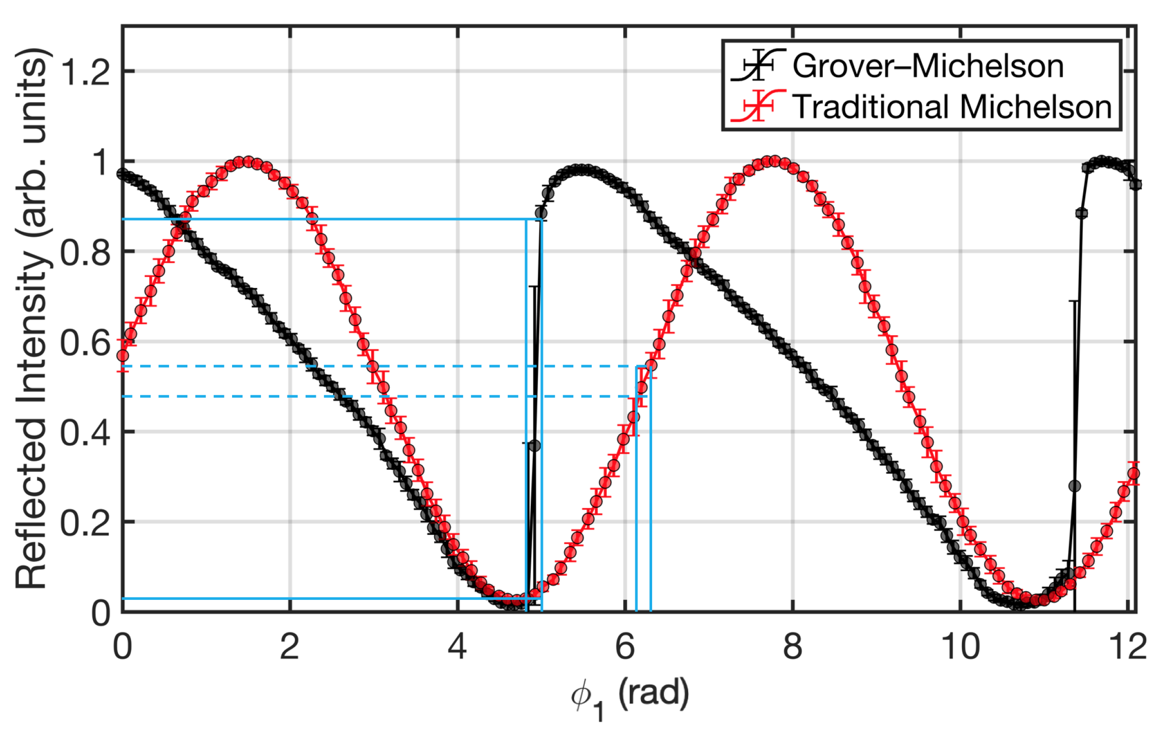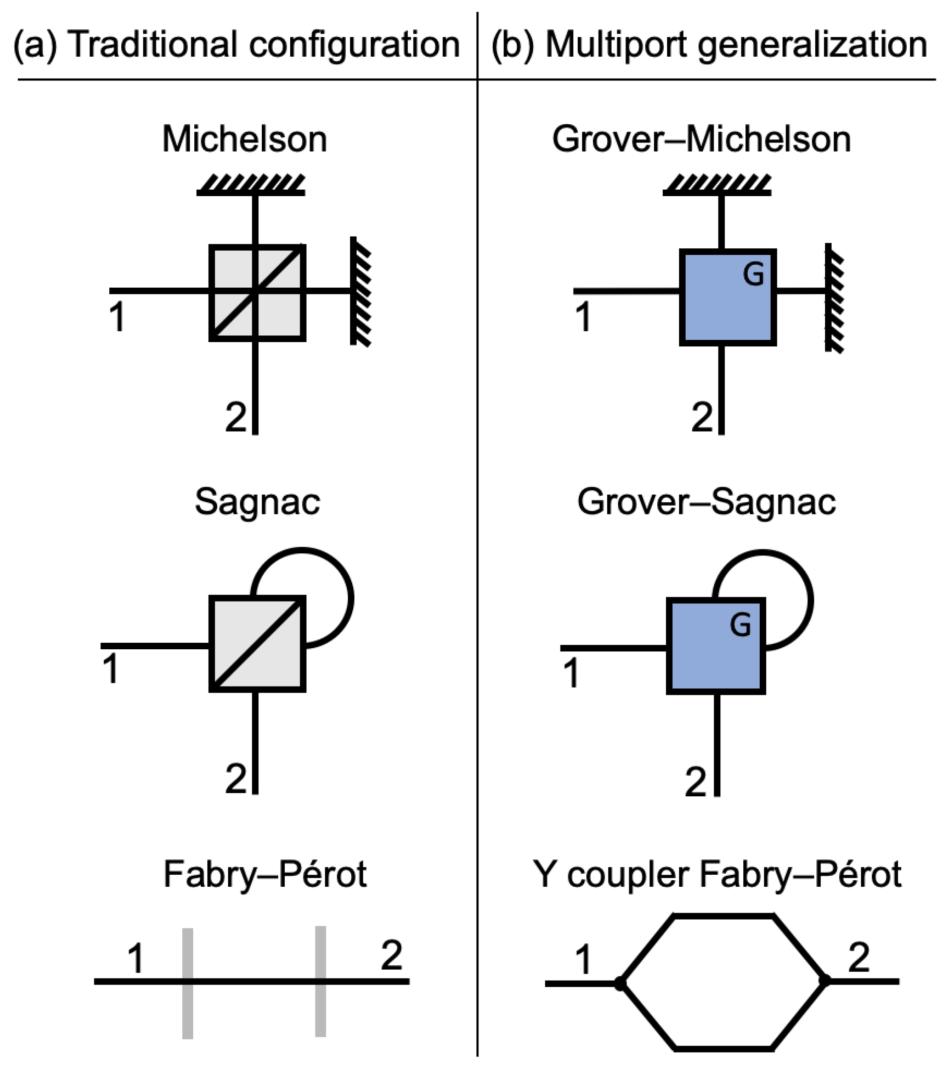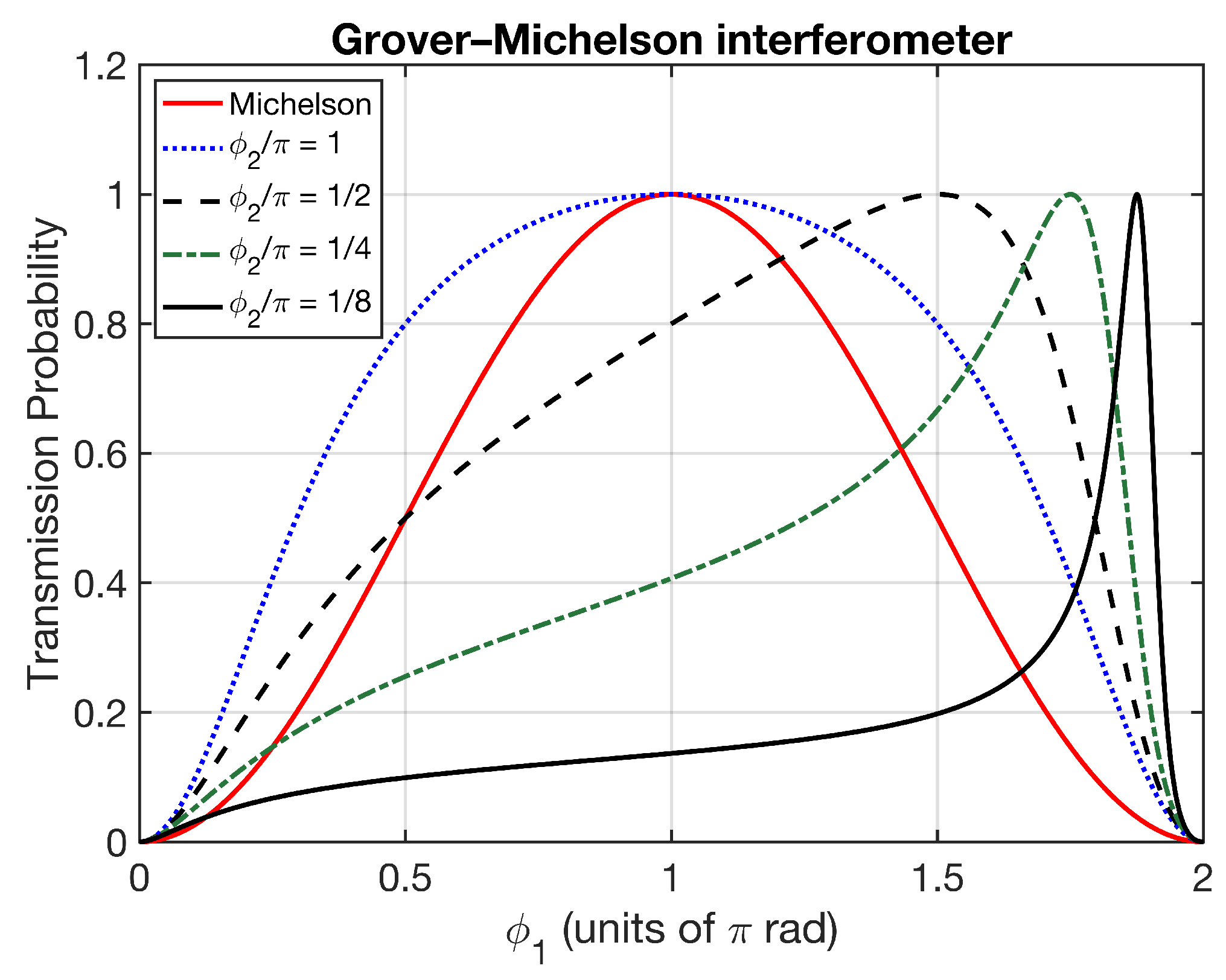 - Schwarze, C.R.; Simon, D.S.; Manni, A.D.; Ndao, A.; Sergienko, A.V. Experimental demonstration of a Grover-Michelson interferometer. Opt. Express 2024, 32, 34116–34127. [Google Scholar] [CrossRef]