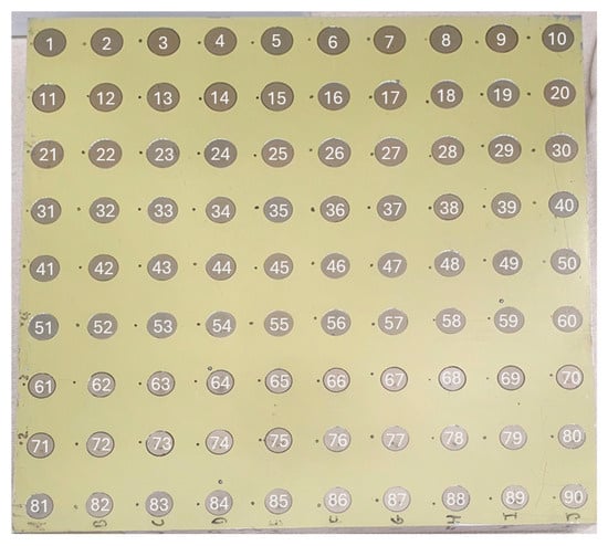 For the 80HSX, the mean intensity is lower than the RTC360, with the majority of the fastener heads producing lower intensity reflections than the painted aerostructure surface. The majority of the fastener heads are clearly visible in the intensity diagram. The highest intensity reflections are not located in the centre of the fastener sample plate due to misalignment of the height of the instrument setup during data collection. The high-intensity reflections are located near the small fasteners, specifically fasteners 65–67, 75–77, 86, and 87, which correlates to some of the large discrepancies in fastener head surface normal direction seen in Figure 5 for the 80HSX.