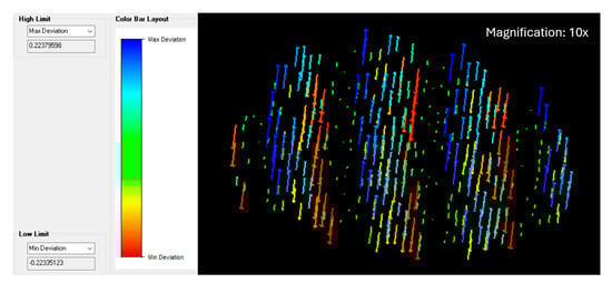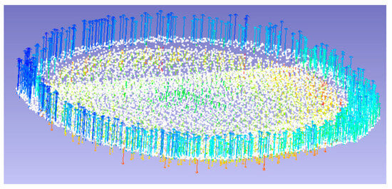 A second surface effect seen in the point clouds from the fastener sample plate is exhibited in Figure 9. A ‘wave’ or ‘ripple’ effect was observed in the surface normals of the fastener heads from the 80HSX. It was theorised that this same ‘ripple’ effect may be present in the RTC360 point cloud but was obscured by large amounts of surface noise. In order to investigate this effect, surface noise was removed from the fastener heads in the RTC360 point cloud from approximately 0.7 mm to 0.2 mm. The surface noise was removed in the Spatial Analyser software environment during the plane fitting process. This mimicked the size of the surface noise in the 80HSX point cloud. A planar surface was fitted to the remaining smoothed points, and the vector graph of each fastener head planar fit is presented in Figure 14.