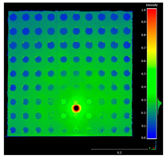 To investigate the cause of the fastener head surface normal angular discrepancies, individual point intensities can be examined. The intensity values in a point cloud represent the strength of the returning signal and can be used to indicate the reflectivity of a given surface. Both the RTC360 and the 80HSX operate on the same 1550 nm wavelength, and therefore a comparison of their backscattered intensity signals can help to clarify the quality of the measured data. A systematic intensity distribution of the RTC360 and the 80HSX point cloud can be seen in Figure 10 and Figure 11. The intensity of the respective point clouds have been adjusted to fit the same scale and therefore can be directly compared. For the RTC360, the intensity values are centred around the middle of the fastener plate, and slowly decrease as they radiate outwards. As the incidence angle of the light increases, the high reflectivity of the metallic surface has less of an effect on the returning signal. At the centre of the diagram, the fastener heads produce a distinctly different intensity signature when compared to the aerostructure surface. However, near the edges of the fastener sample plate, the fastener heads and the aerostructure surface have similar intensity returns. These systematic variations challenge intensity-based feature detection of fastener heads in the RTC360 point cloud.