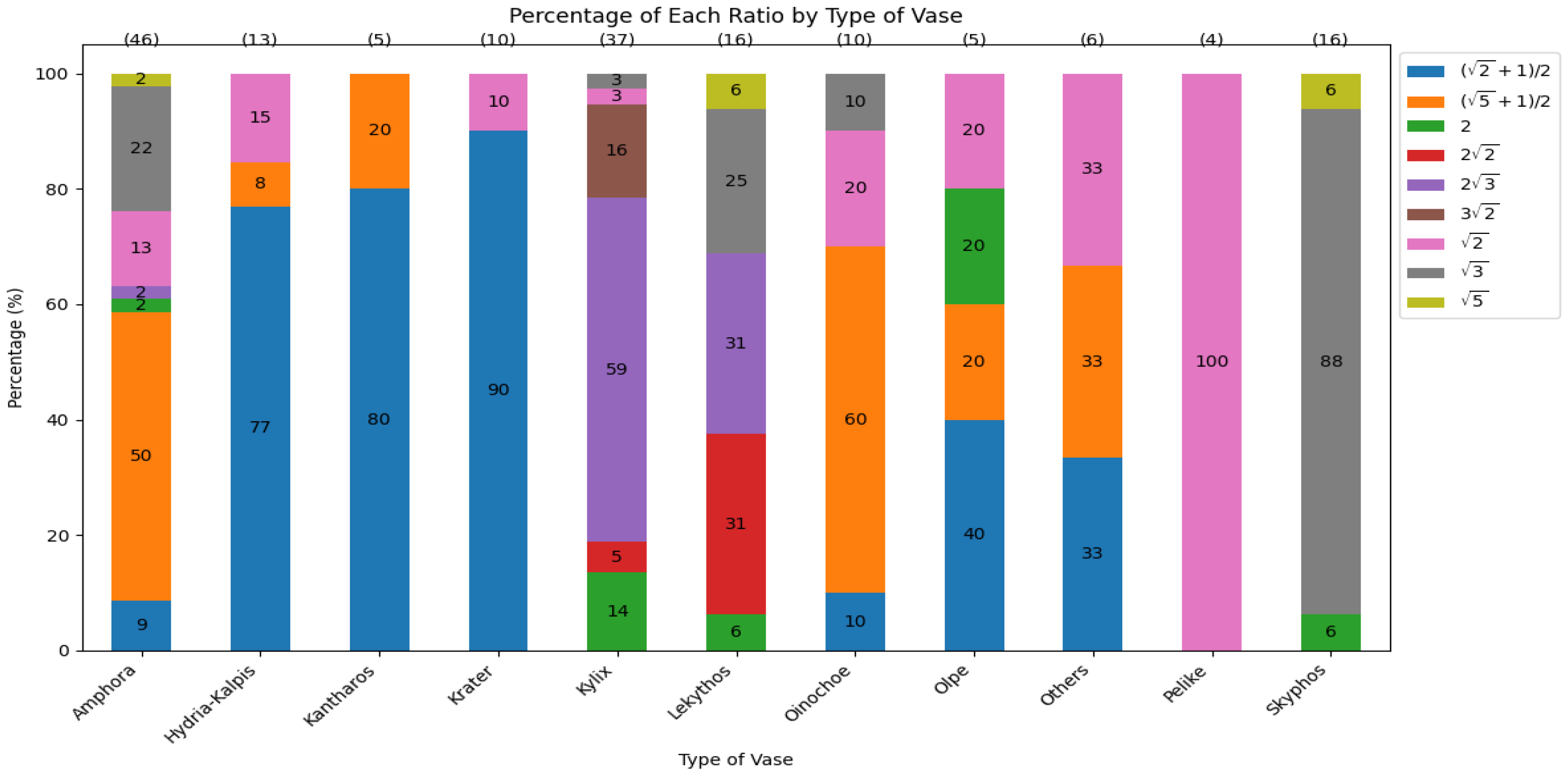 with 30. In the golden ratio, most of the vases are amphora (23), and for