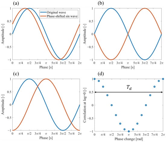 Theoretical diagram of Doppler frequency analysis using the PW Doppler method: (a) time signal with a phase shift of —, (b) time signal with a phase shift of —, (c) time signal with a phase shift of —, and (d) variation of correlation values with a phase change.