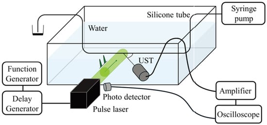 The experimental setup for the time-shift method is shown in Figure 2. A particle suspension prepared by mixing black particles with a solution was used as the measurement target. The suspension was injected into a silicone tube with outer and inner diameters of 1.5 mm and 1.0 mm, respectively. We used black paramagnetic polyethylene particles with a specific gravity of 1.2 and a particle diameter in a range of 53–63 m (redCospheric: Santa Barbara, California, USA, BKPMS-1.2 53–63 m). The solution was prepared by mixing water and glycerol at a mass ratio of 1:4.2 to prevent the particles from settling; this resulted in a specific gravity of 1.2. An Nd:YAG pulsed laser with a wavelength of 532 nm and a pulse duration of 5–9 ns (redRayture Systems: Shinjuku, Tokyo, Japan, GAIA Dual) was used as the irradiation source. Although the maximum repetition rate of a single laser was around 20 Hz, two lasers were used in combination, and the pulse interval was controlled using a function generator (redRigol Technologies: Suzhou, China, DG1022Z) and a delay generator (Quantum Composers: Bozeman, Montana, USA, 9618). A focused UST (redEvident Scientific: Shinjuku, Tokyo, Japan, V311-SU) with a center frequency of 10 MHz, a focal length of 30 mm, and a focal diameter of 2 mm was used. The UST was connected to an amplifier to amplify the signal, which was then recorded using an oscilloscope (redRohde & Schwarz: Munich, Bavaria, Germany, RTM3004). The timing of the laser irradiation was detected using a photodetector (redThorlabs: Newton, New Jersey, USA, DET10A2).