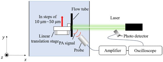 Experimental configuration at the PW Doppler measurement: Black polyethylene particles were used as light-absorbing particles, and a nano-second pulsed laser was irradiated. A particle suspension solidified with agar was placed in the flow tube, and it was displaced at equal intervals using a redlinear translation stage.