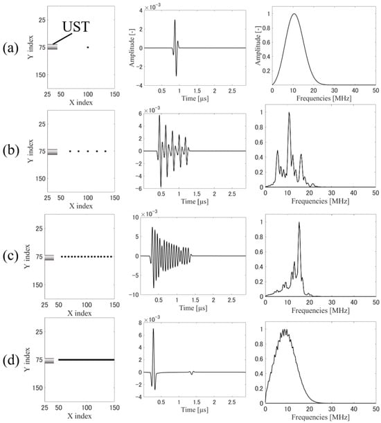 Simulation of directional UST: A 150 × 150 × 150 grid with a spacing of 15 m was generated, and an omnidirectional sensor with a center frequency of 10 MHz and a frequency range from 3.8 MHz to 16.2 MHz was placed at (25, 75, 75). (a) Simulation results with a single particle: The spectrum peak spreads around 11 MHz in accordance with the characteristics of the sensor. (b) Simulation results with five particles: With the increase of inter-particle distance, the signals hardly overlap. Further the spectrum spreads around 10 MHz, following the characteristics of the sensor. (c) Simulation results with 16 particles: The signals overlap, which lead to a reduction in low-frequency components. (d) Simulation results with 100 particles: The particles overlap and form a cylindrical initial pressure distribution. The signals overlap, and the spectrum shifts toward the lower frequency range compared to (a).