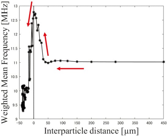 Relationship between inter-particle distance and weighted-averaged frequency spectrum (WAFS) in directional UST. The horizontal axis represents the particle spacing, and the vertical axis shows the WAFS of the frequency spectrum obtained from the simulation results. Up to around 50 m, the WAFS remains nearly unchanged where the signals do not overlap. The low-frequency components decrease as the signals begin to overlap causing the WAFS to increase. When the particle spacing falls below 0 m, which results in overlapping particles, a downshift occurs toward lower frequencies occurs. This continues until the particles completely overlap, forming a cylindrical initial pressure distribution.