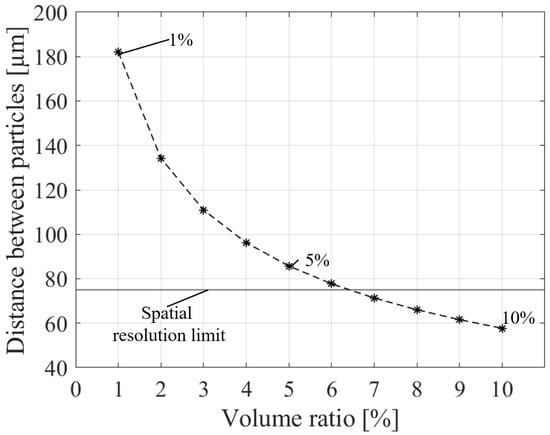 Particle spacing at each volume fraction of particles. The horizontal axis represents the VFP, and the vertical axis represents the particle spacing. Comparing the spatial resolution of 75 m red (illustrated as horizontal line) with the particle spacing, at 1% VFP, the particle spacing is well above the spatial resolution, whereas at 10% VFP, it falls below the redresolution.