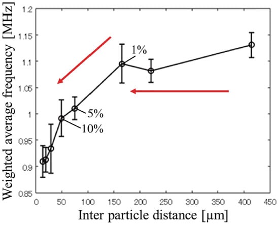 Spatial averaging occurs in an omnidirectional UST when the inter-particle distance falls below the lateral spatial resolution, and low-frequency components become dominant. Figure 7 shows that the particle spacing is well above the spatial resolution at 1% VFP; however, it falls below it at 10% VFP. In addition, as shown in Figure 11, at 10% VFP, low-frequency components become dominant compared to those at 1% VFP. Under the experimental conditions of this study, increasing VFP causes the inter-particle distance to fall below the spatial resolution, which leads to spatial averaging. The spatial averaging prevents the identification of individual particles, thereby hindering the observation of particle movements and leading to an underestimation of flow velocity. This is likely because the focal diameter (2 mm) of the UST at the experiment was 40 times larger than the particle diameter (50 m), leading to the omnidirectional effect becoming dominant.