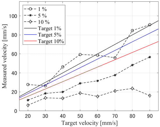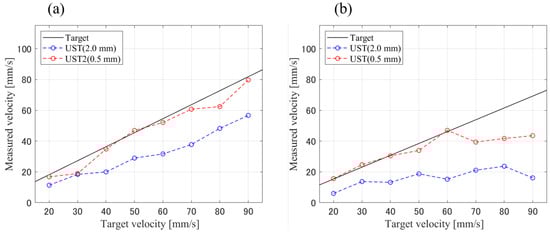 - In the measurement with a UST (2.0 mm), the bias relative to the set flow velocities was −36% at 5% VFP and −65% at 10% VFP for the time shift method. The reduction in the degree of underestimation was confirmed when using a focused UST (0.5 mm), as the stronger influence of the UST’s directionality led to a smaller measurement volume. Biases of −6.9% at 5% VFP and −24% at a 10% VFP were obtained.