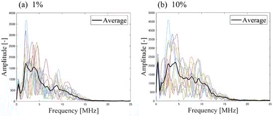 Simulation of omnidirectional UST. A 150 × 150 × 150 grid with a spacing of 15 m was generated, and an omnidirectional sensor with a center frequency of 10 MHz and a frequency range from 3.8 MHz to 16.2 MHz was placed at (20, 75, 75). At 1% VFP, where the particle spacing is below the spatial resolution, the frequency spectrum follows the characteristics of the sensor and is distributed around 11 MHz. At 10% VFP, where the particle spacing is also below the spatial resolution, it increases the low-frequency components of the frequency spectrum. At 40% VFP, the low-frequency components further increase.